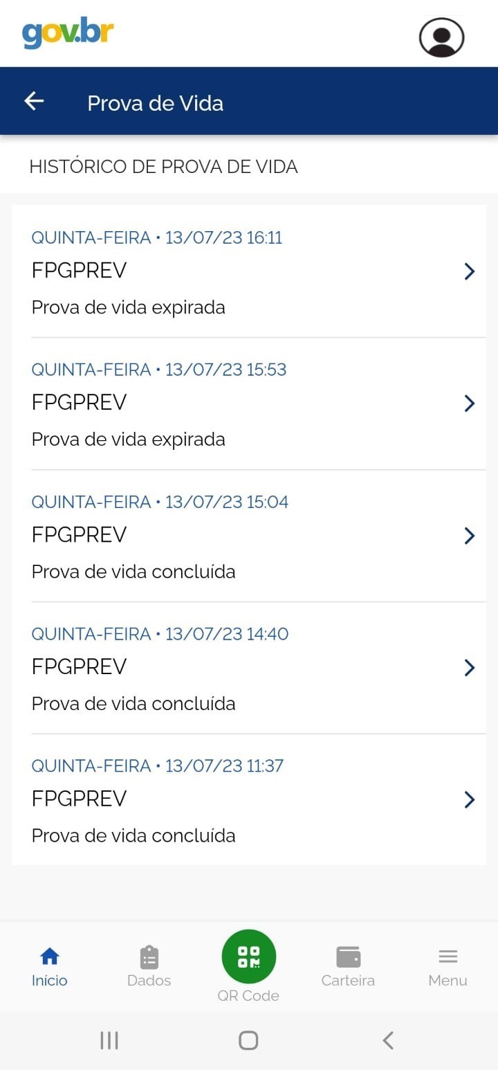 Vale observar que o histórico disponível pelo aplicativo pode incluir provas de vida realizadas em outros órgãos. Para saber se o histórico diz respeito ao FPGPREV, basta procurar pelo título FPGPREV.