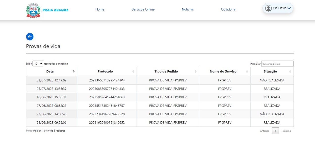 Uma vez acessado, caso já tenha realizado alguma prova de vida recentemente, será apresentado um botão escrito PROVA DE VIDA. Ao acessar, será mostrado seu histórico de Prova de Vida realizado a partir de agosto de 2023.