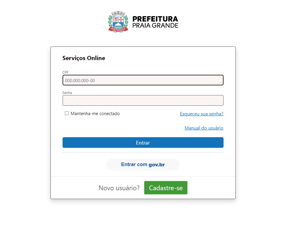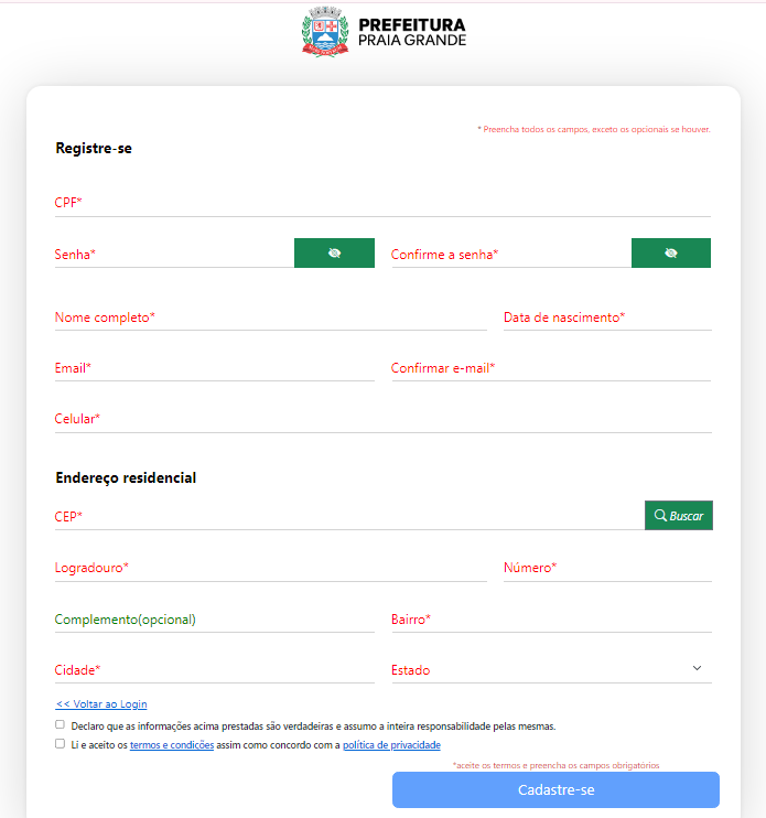 Caso seja novo e não possua cadastro, basta clicar no botão cadastre-se que o sistema irá solicitar os dados necessários.